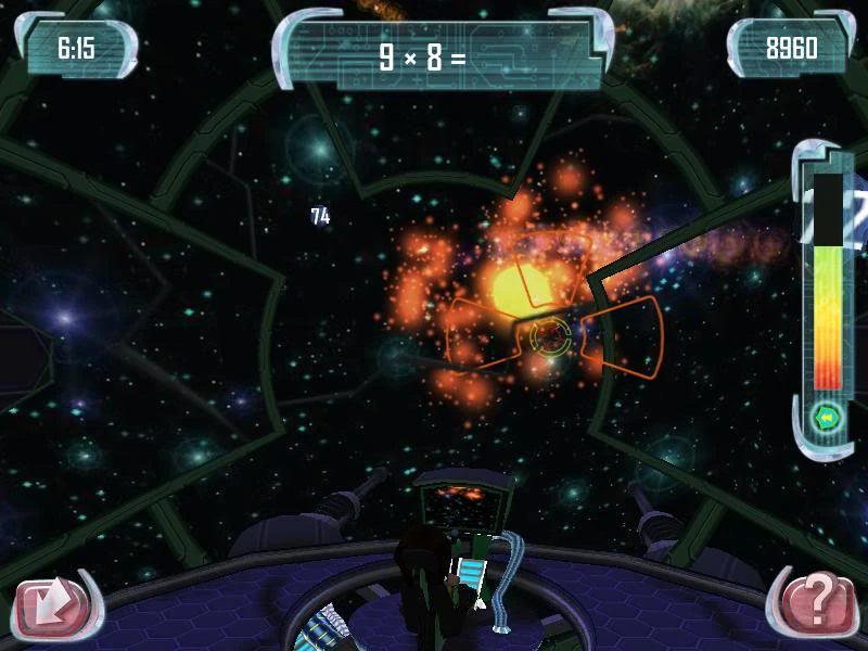 The player has control of a starship's laser and must blast the object in space marked with the correct answer to an equation.